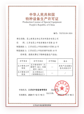 2021年8月昆山新莱洁净应用材料股份有限公司获得安全生产标准化二级企业(机械)证书。